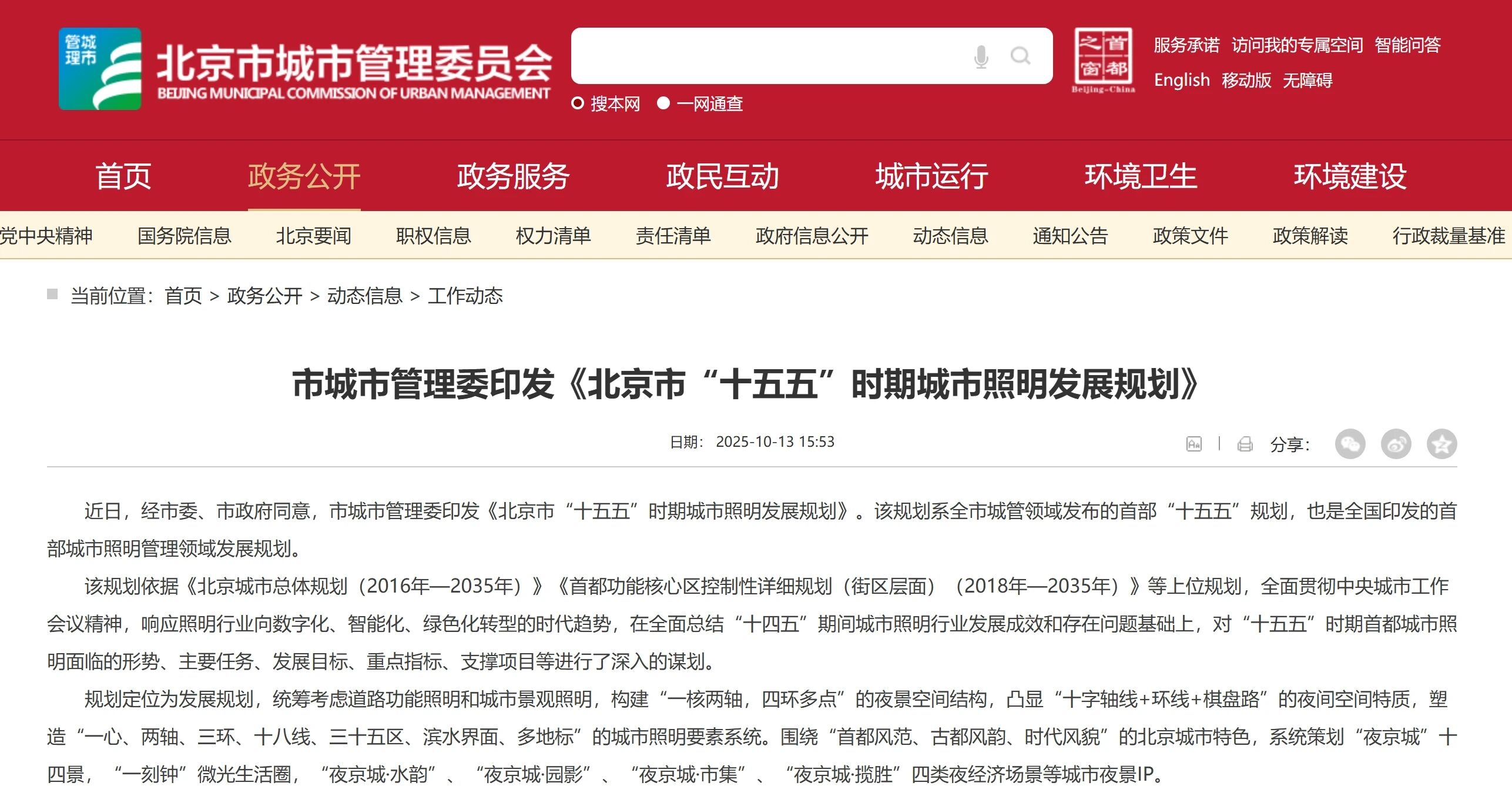就在近期,北京市城市管理委员会也正式印发了《北京市“十五五”时期城市照明发展规划》。官方网站10月13日的发文显示,该规划不仅是北京全市城管领域发布的首部“十五五”规划,也是全国首部城市照明管理领域的“十五五”发展规划。