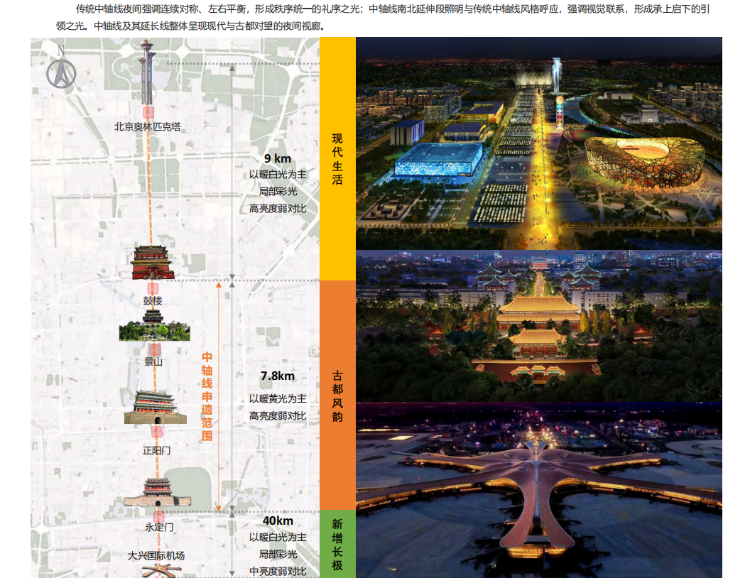 ▲中轴线及其延长线整体呈现现代与古都对望的夜间视廊(图源:《北京市“十五五”时期城市照明发展规划(重点区域照明效果指引)》)